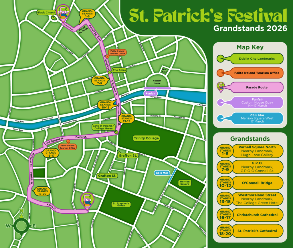 For the best parade experience, consider a grandstand ticket from stpatricksfestival.ie. They sell out quickly but offer reserved seating with great sightlines along the route.